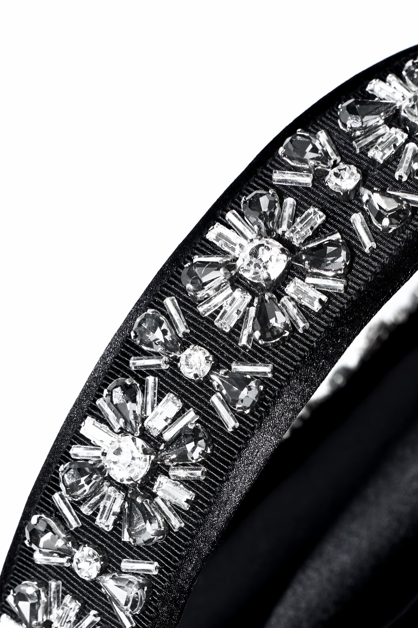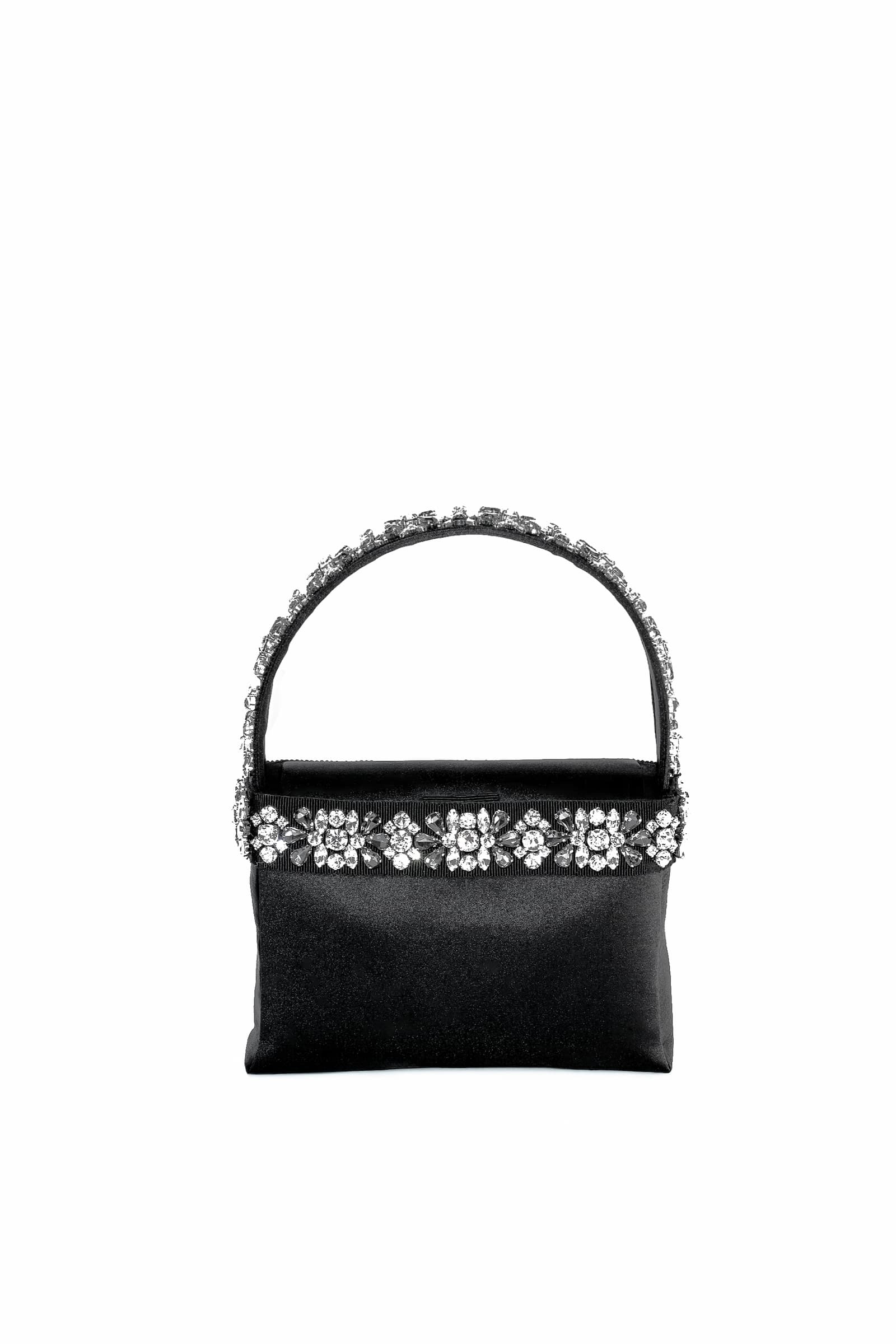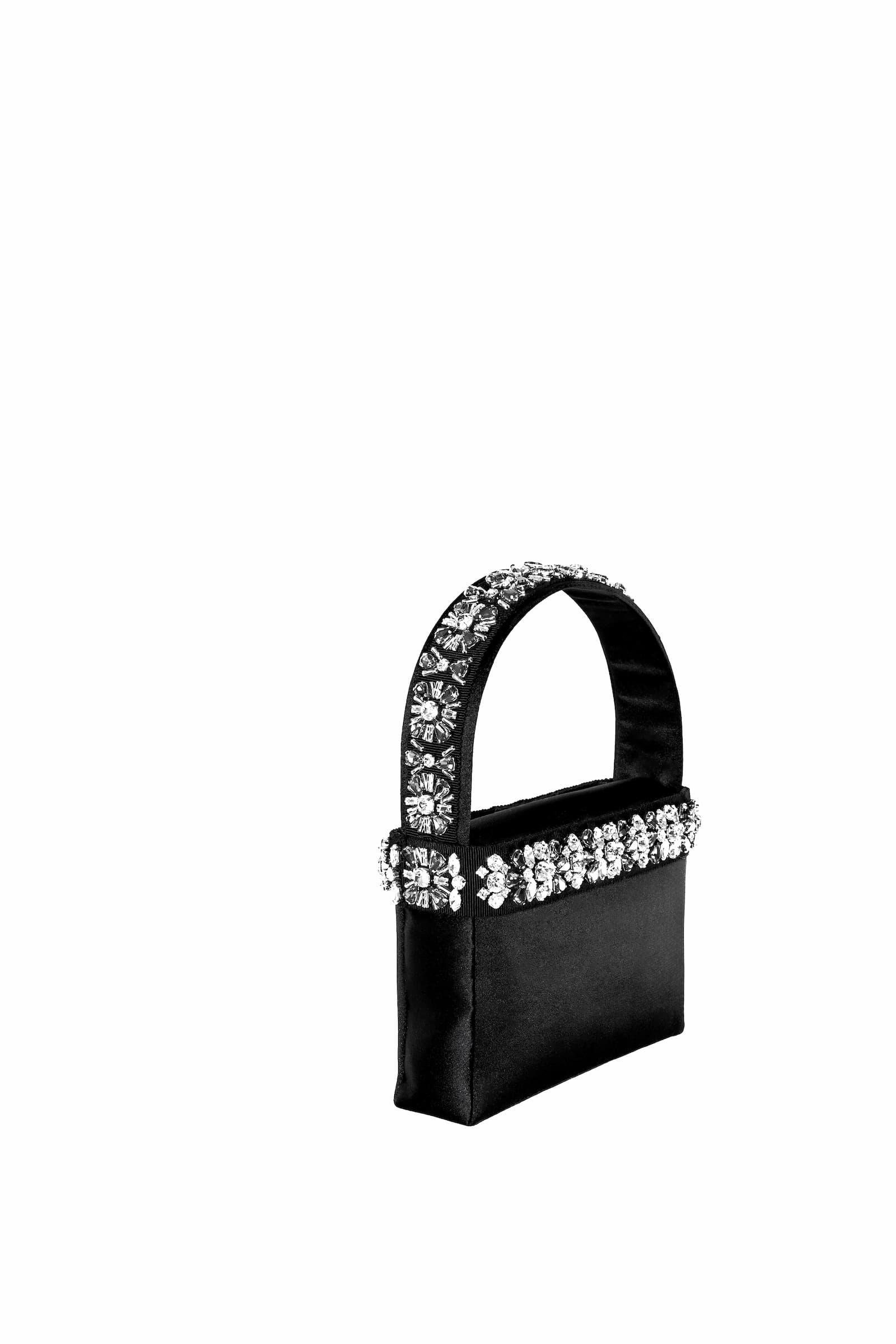 • IL RICAMO E’ EFFETTUATO SU NASTRO DI GROS GRAIN CON STRASS VARIE FORME E MISURE COL.CRISTALLO E FUME’ RIAPPLICATO A MANO SULLA BORSA E SUL MANICO
